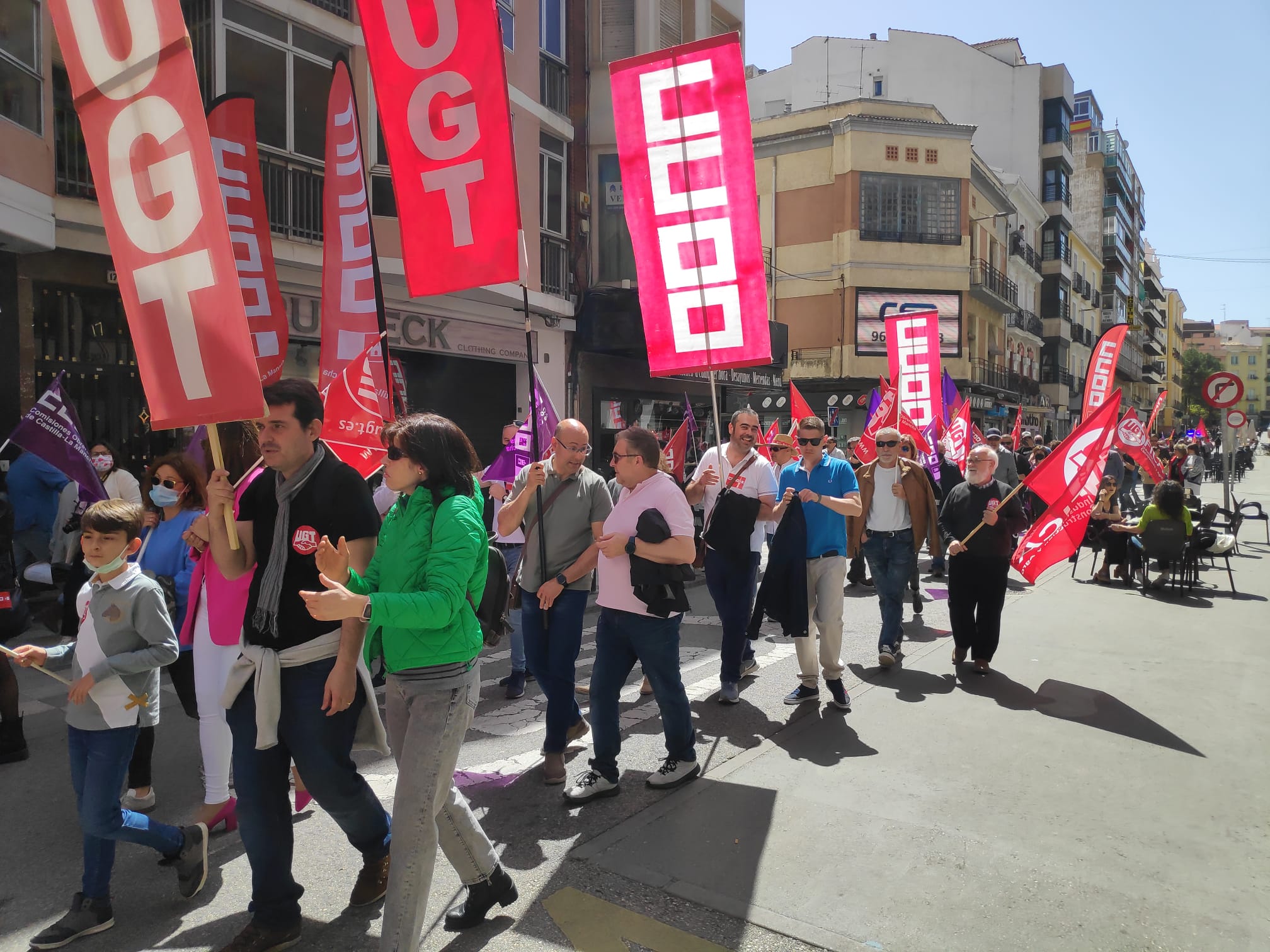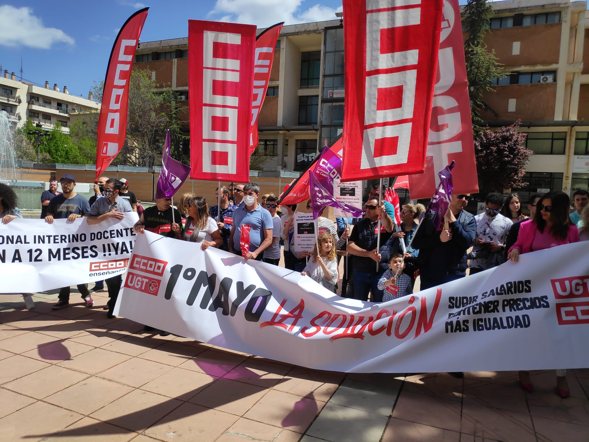 Los sindicatos CCOO y UGT han salido a la calle este Día Internacional del Trabajo en el que han reivindicado a la patronal que ponga en marcha subidas salariales para paliar la inflación de precios a los empleados. La convocatoria, en una soleada y cálida mañana de domingo que ha coincidido con la celebración del Día de la Madre, ha reunido entre 150 y 200 personas según fuentes policiales y del Ayuntamiento de Cuenca.