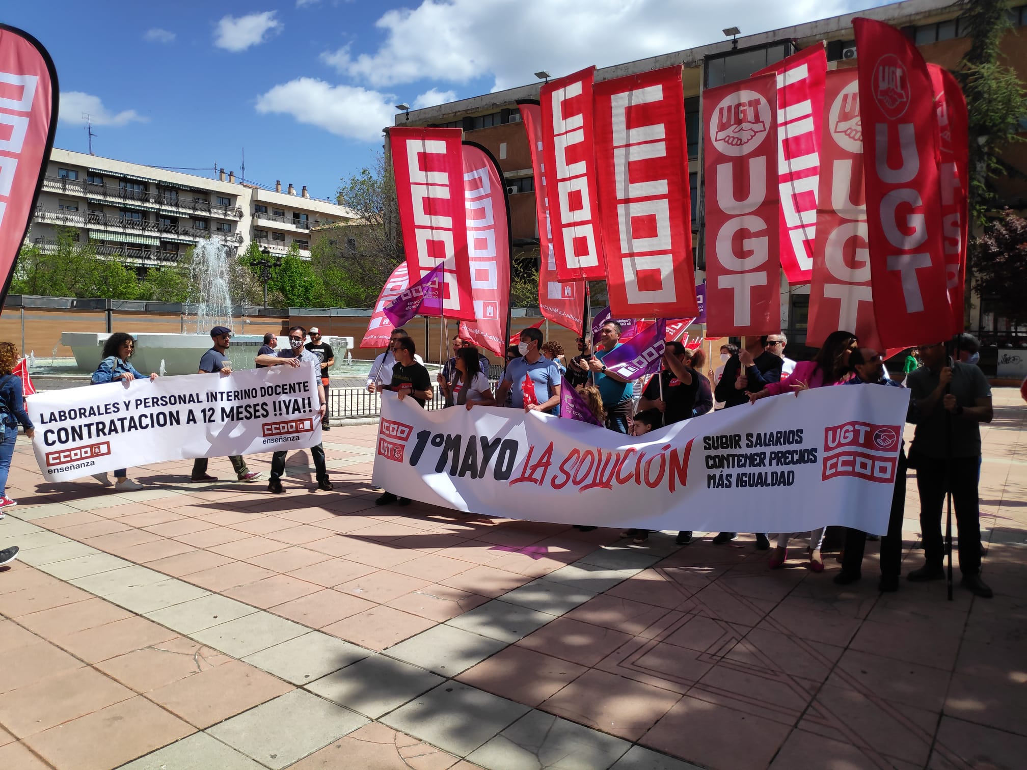 ‘Laborales y personal interion docente. Contratación a 12 meses ¡ya!’, ‘1º de mayo, la soución subir salarios, contener precios y más igualdad’ y ‘plantellas del sector financiero seguimos siendo imprescindibles, no a las presiones comerciales y no a los objetivos inasumibles’ han sido algunas de las pancartas que se han podido leer en esta mañana de domingo.