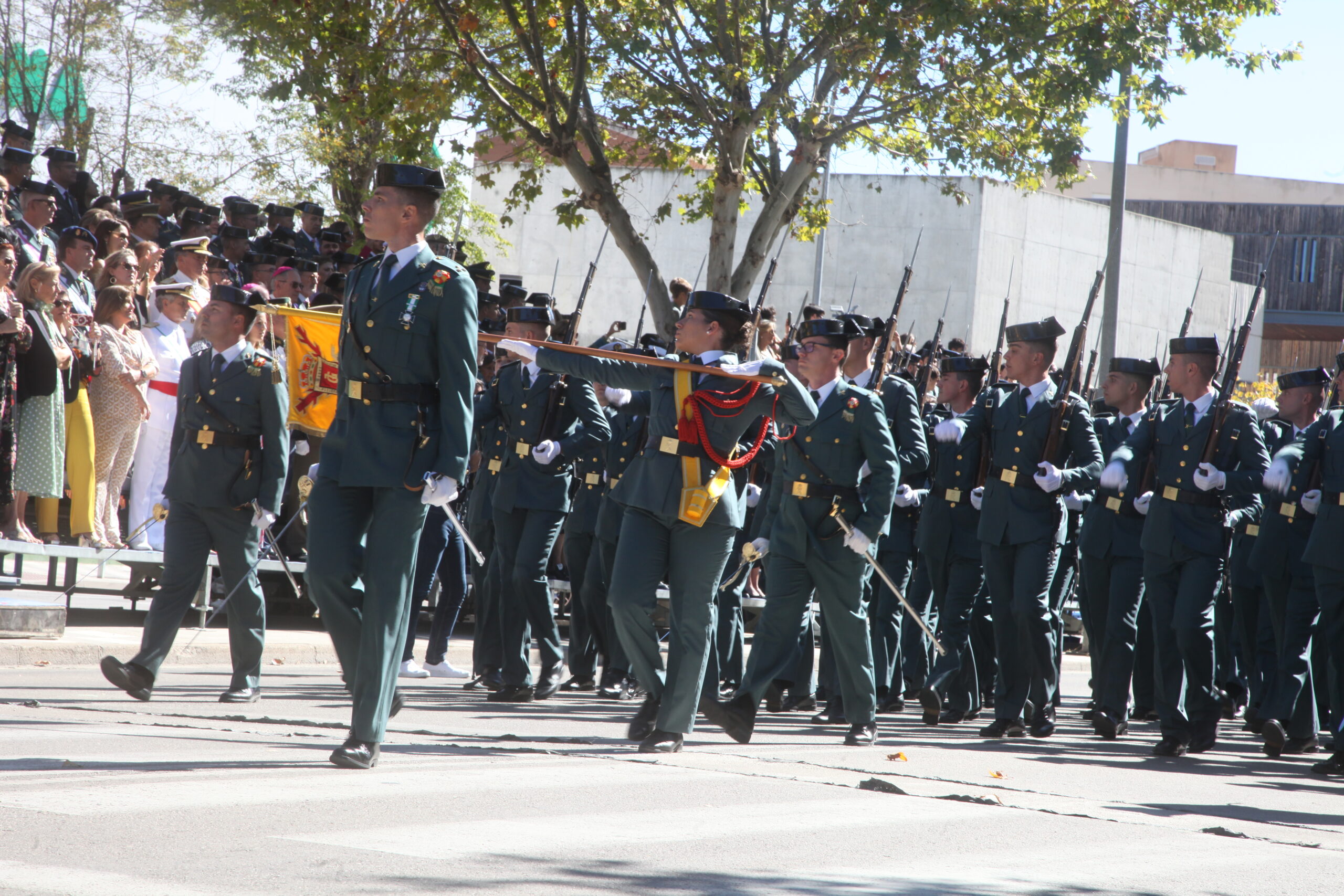 La parada militar ha comenzado con la llegada de dos escuadrones de la Guardia Civil que han formado filas frente a la tribuna de autoridades para después incorporar la bandera nacional a formación. El ministro ha pasado revista a las diferentes unidades entre las que se encontraban la Academia de Oficiales de la Guardia Civil de Aranjuez, la Academia de Suboficiales de la Guardia Civil con sede en San Lorenzo de El Escorial, la compañía del Colegio de Guardias Jóvenes “Duque de Ahumada” Valdemoro, el batallón de Mando y Bandera y la Agrupación de Reserva y Seguridad, entre otros.