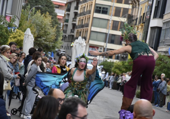 En cabeza, los ritmos tradicionales de los Dulzaineros Pipirigay se mezclaban con las acrobacias y malabres imposibles de Asalto Circo, que iban caracterizados como magníficos personajes de fantasía procedentes de lo profundo del bosque. Hadas, guardianes de la naturaleza e incluso un zancudo que vestía su cabeza con ramas y hojas han iniciado el pasacalles.